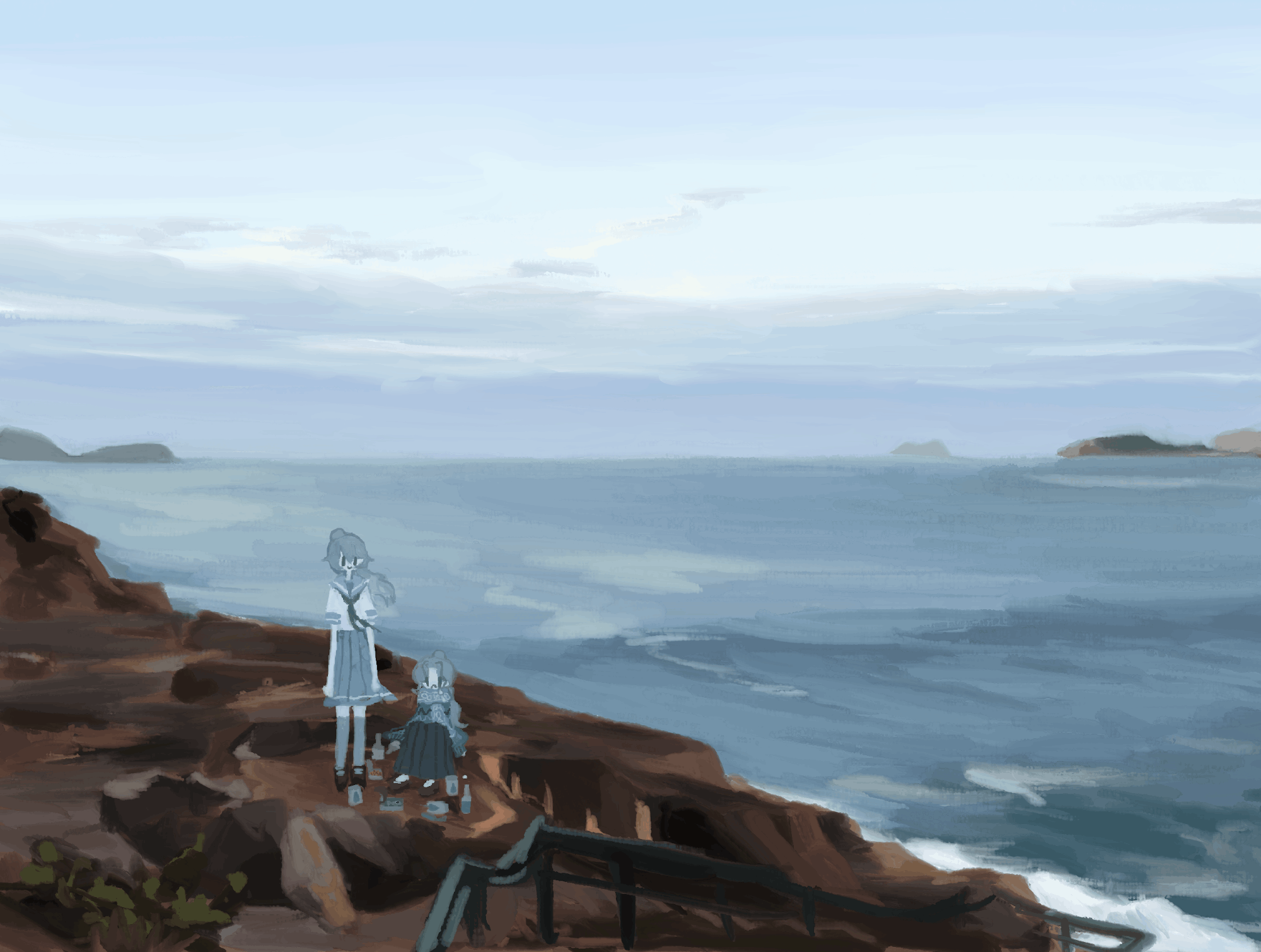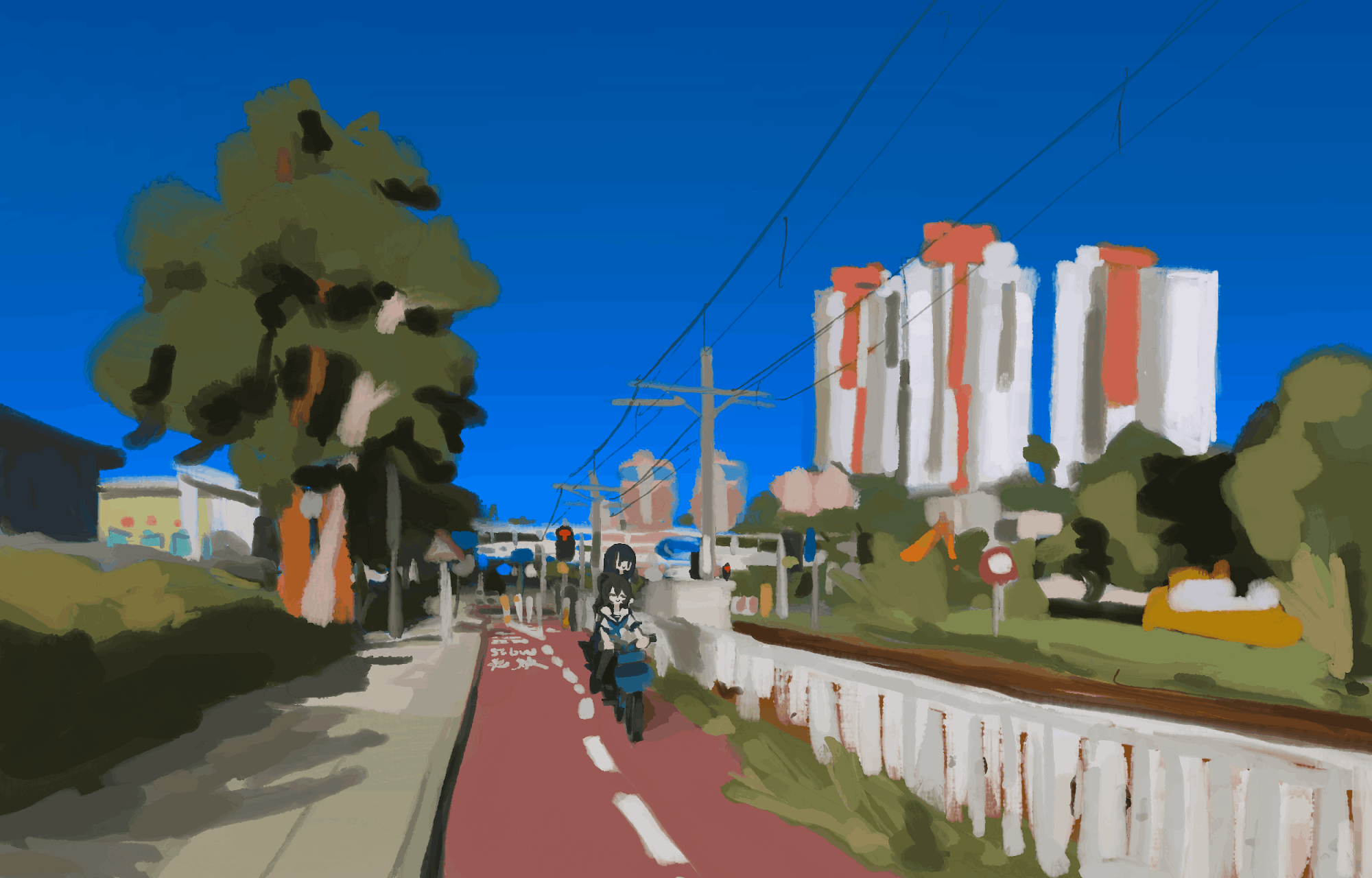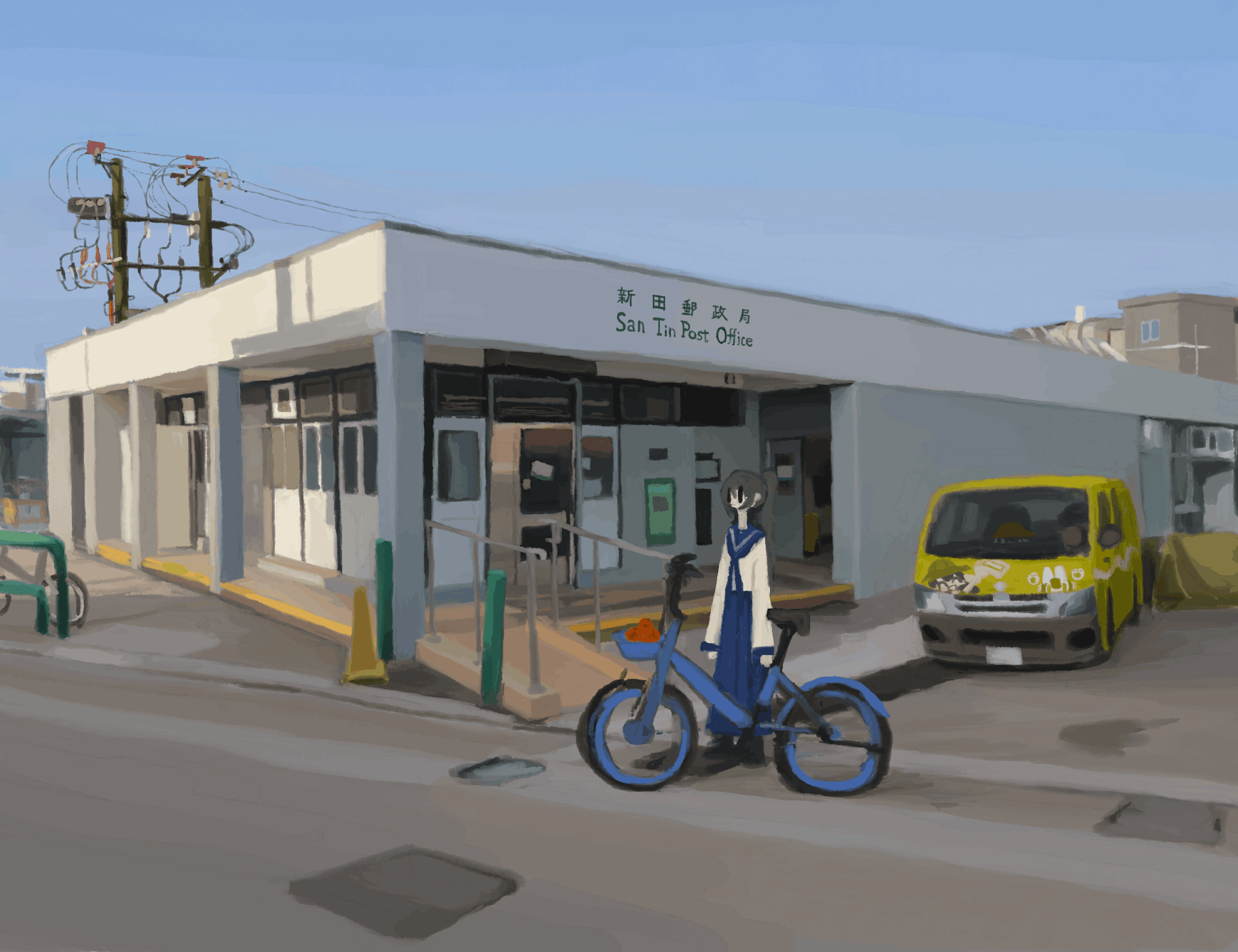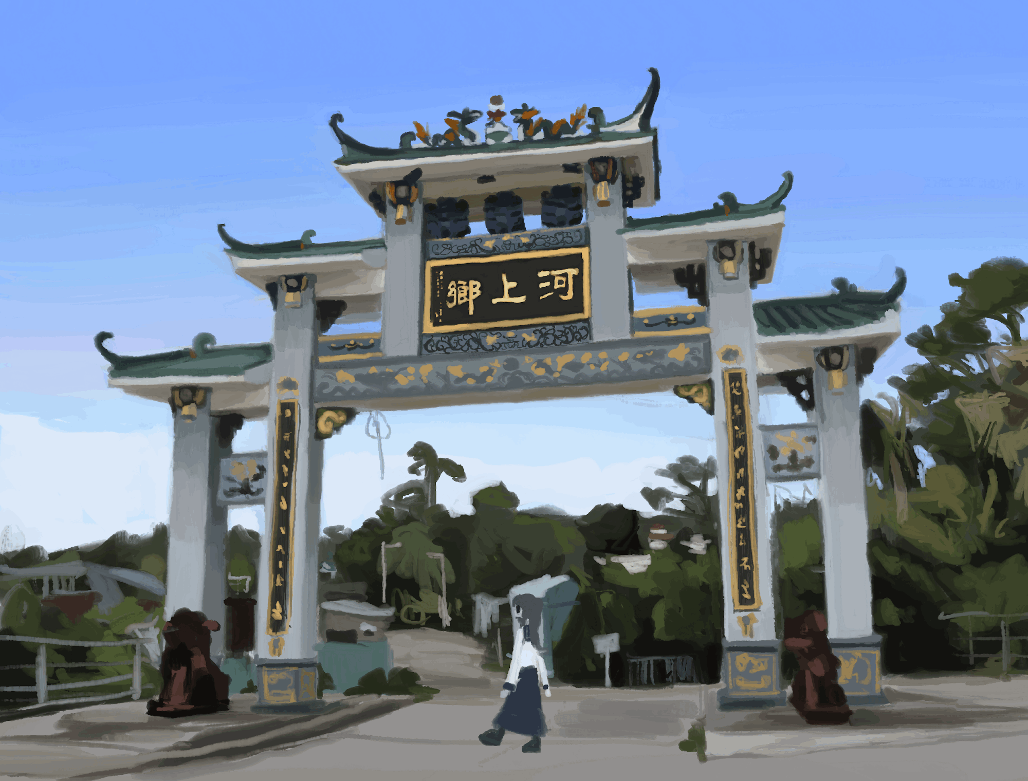 四幅創作對應的地理位置由下而上分別是屏山、新田、河上鄉和大浪灣,創作時間橫跨二五年的九月到二六年一月。當時我正在被鄉郊包圍的新界實習。在此之前的六月我又在日本遊覽了很多的鄉郊城鎮,帶給我創作其中三幅作品的靈感。不同的季節和温度使圖片的色調和天空的顏色也有所差別。